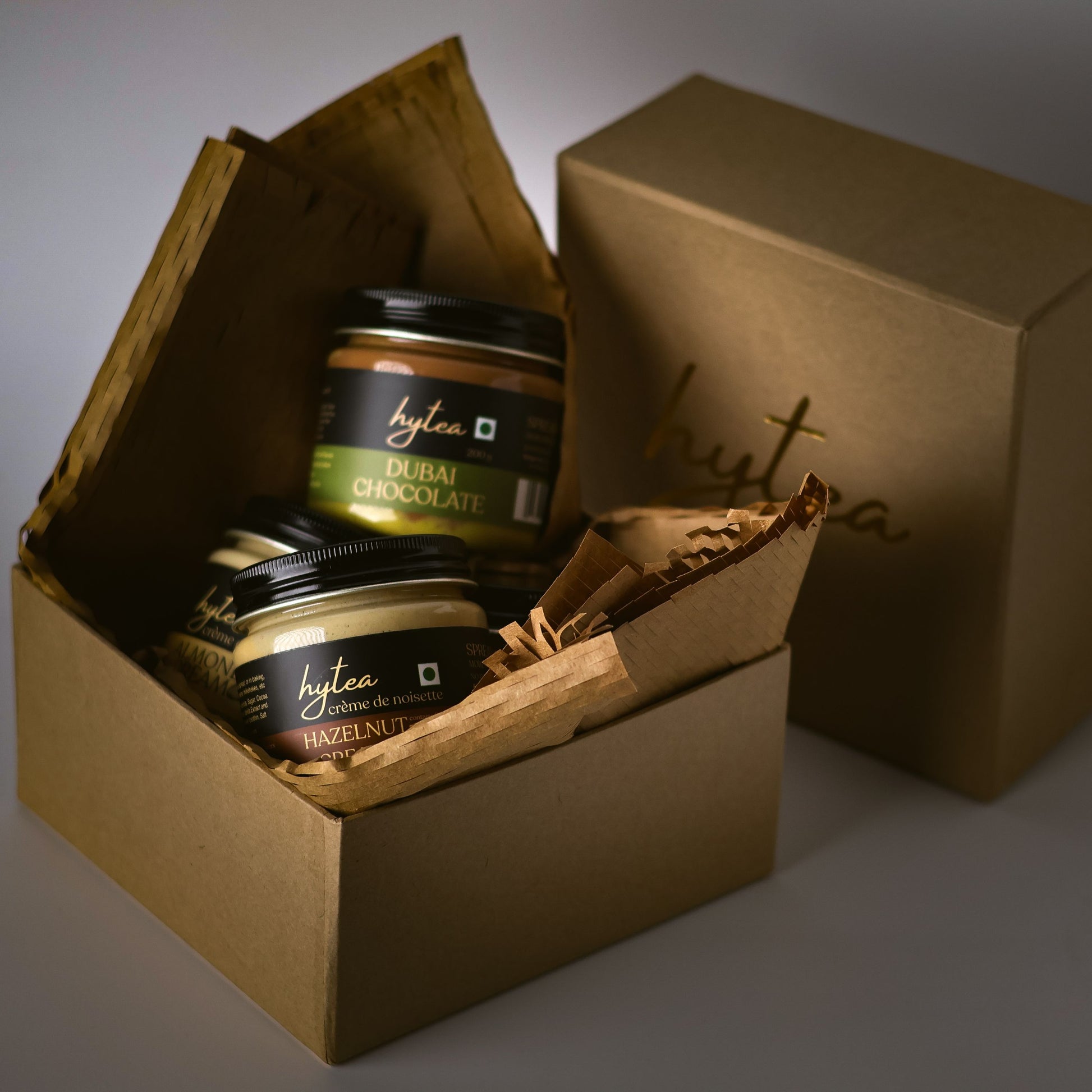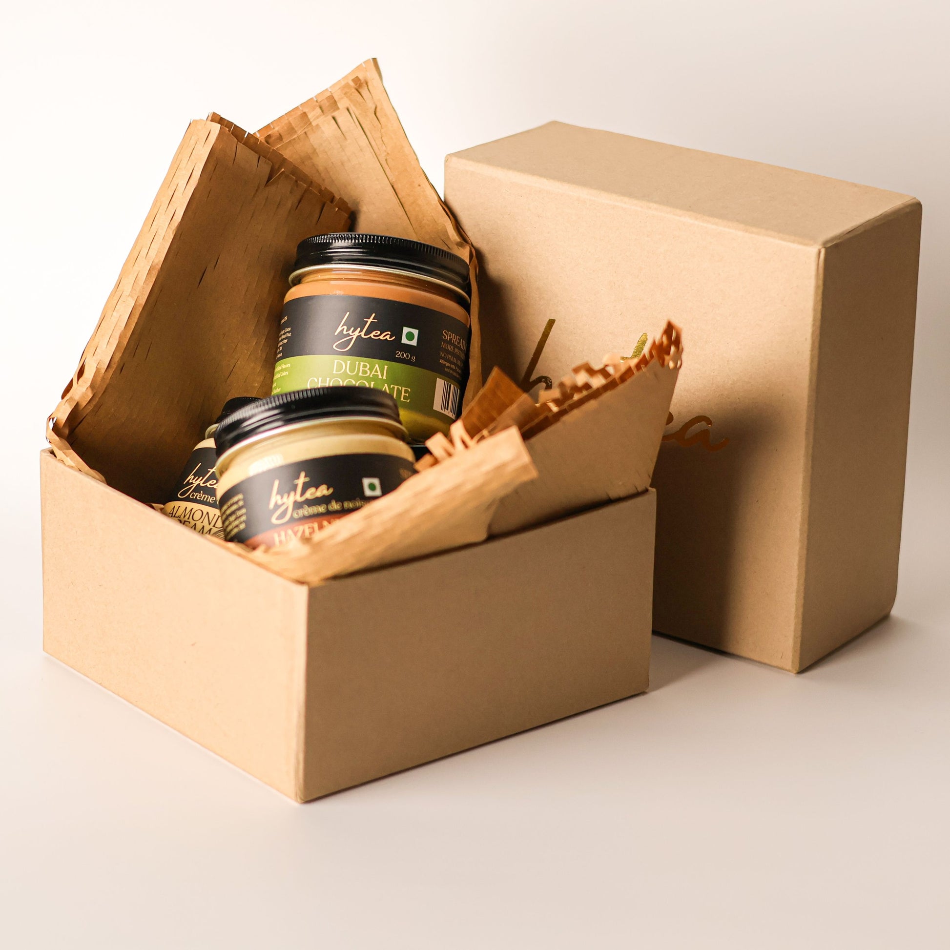 Box Contains: Almond Cream, Hazelnut Cream, Dubai Chocolate and Saffron Almond Cream, 200 g each