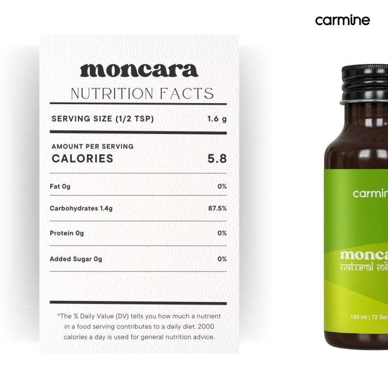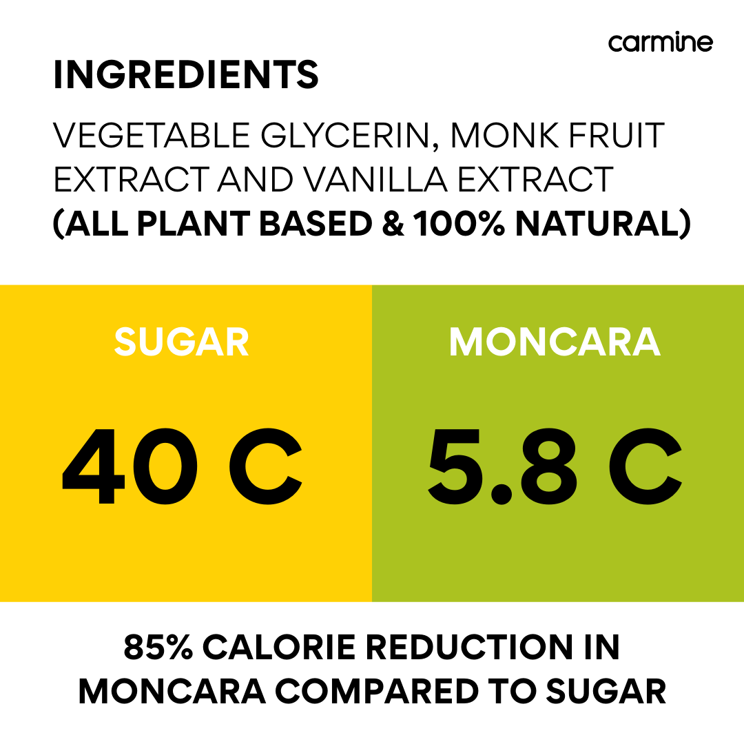 Say goodbye to sugar spikes, extra calories, and chemical sweeteners. Carmine Moncara is a clean-label, all-natural liquid sweetener crafted from Monk Fruit Extract, Vegetable Glycerin & Vanilla Extract. With 85% fewer calories than sugar and a zero glycemic index, Moncara is diabetic-safe, keto-friendly, vegan, and gluten-free.
