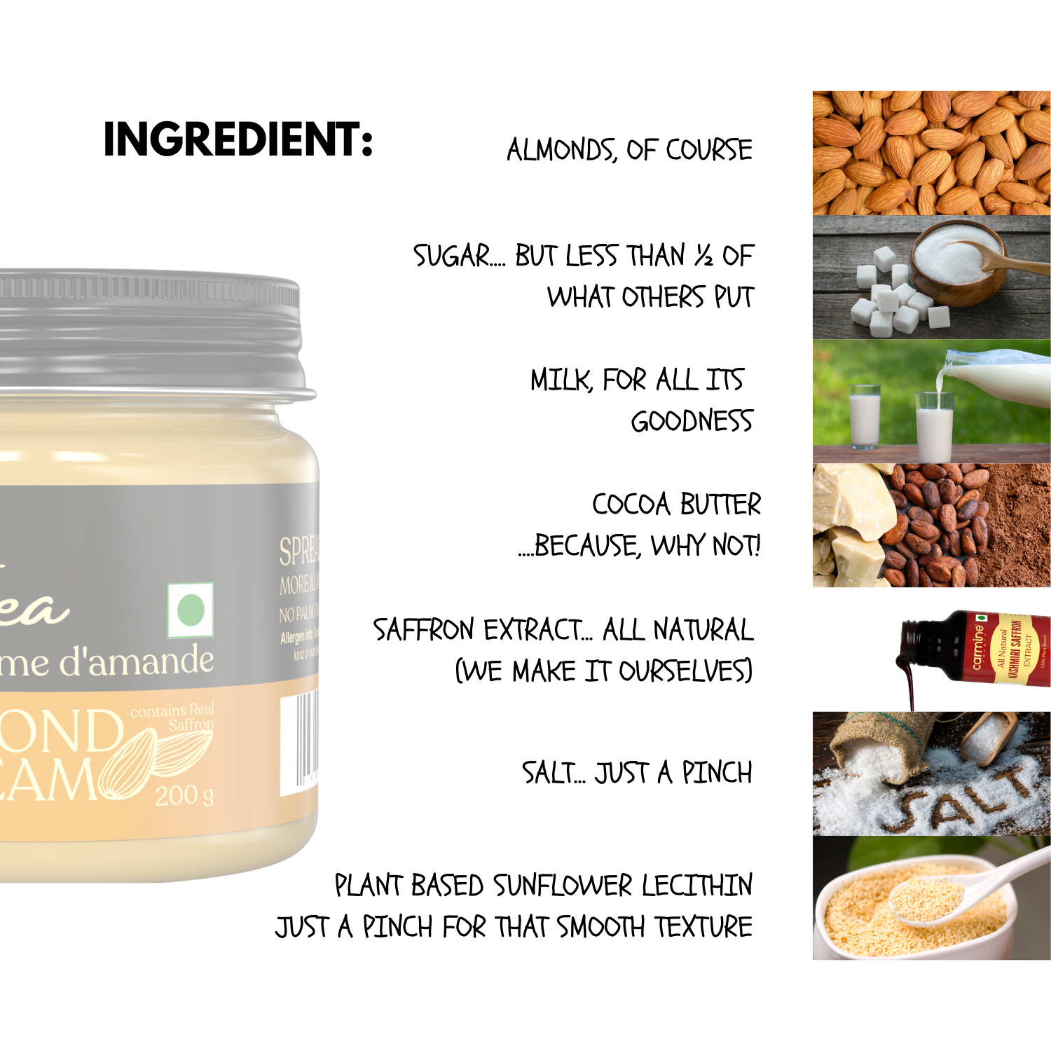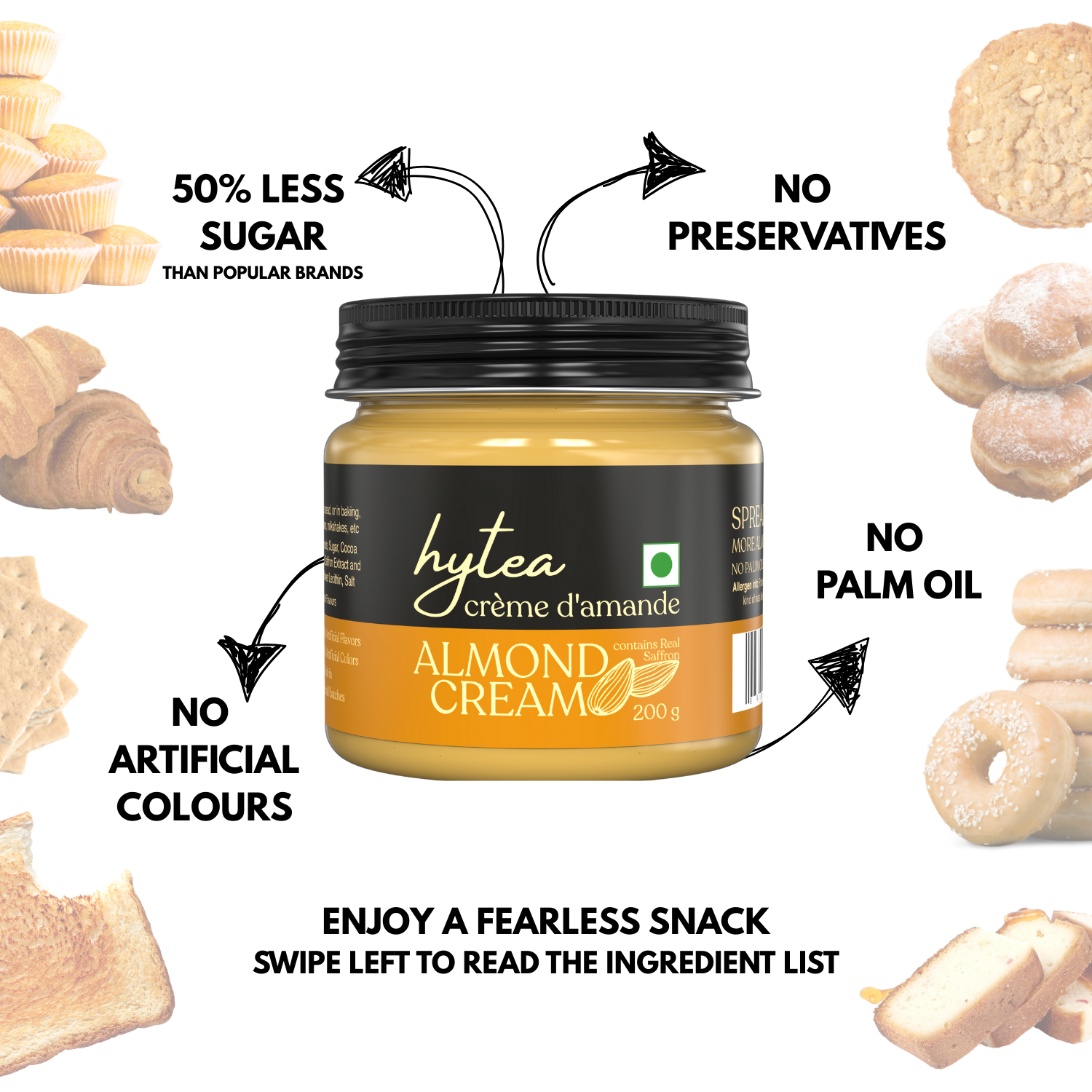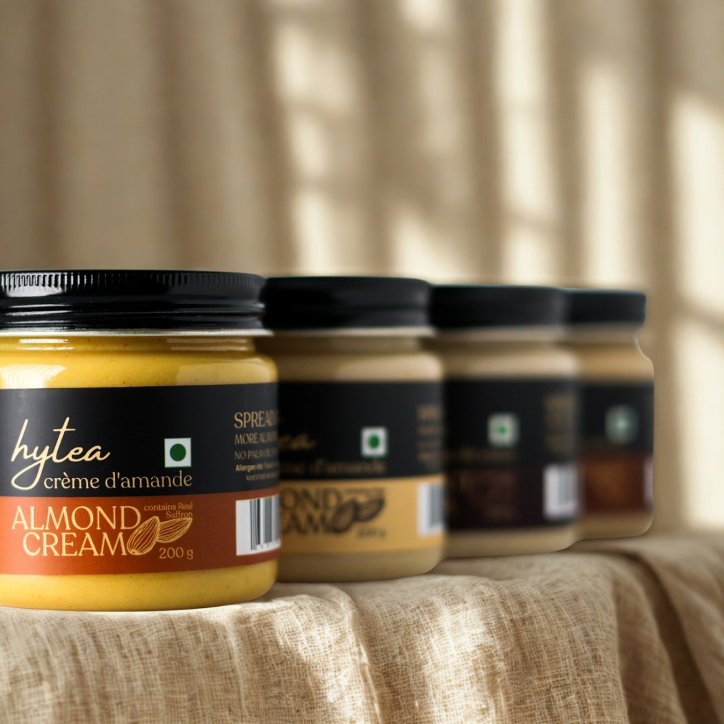 Delight in the royal blend of Hytea Saffron Almond Cream — a clean-label spread infused with the richness of premium almonds and the luxurious real saffron. Crafted with cocoa butter, creamy milk, natural vanilla, and a hint of sweetness, this spread delivers a warm, indulgent experience with every bite. No preservatives, no artificial additives — just a regal twist on everyday snacking that honors purity and flavor in equal measure.