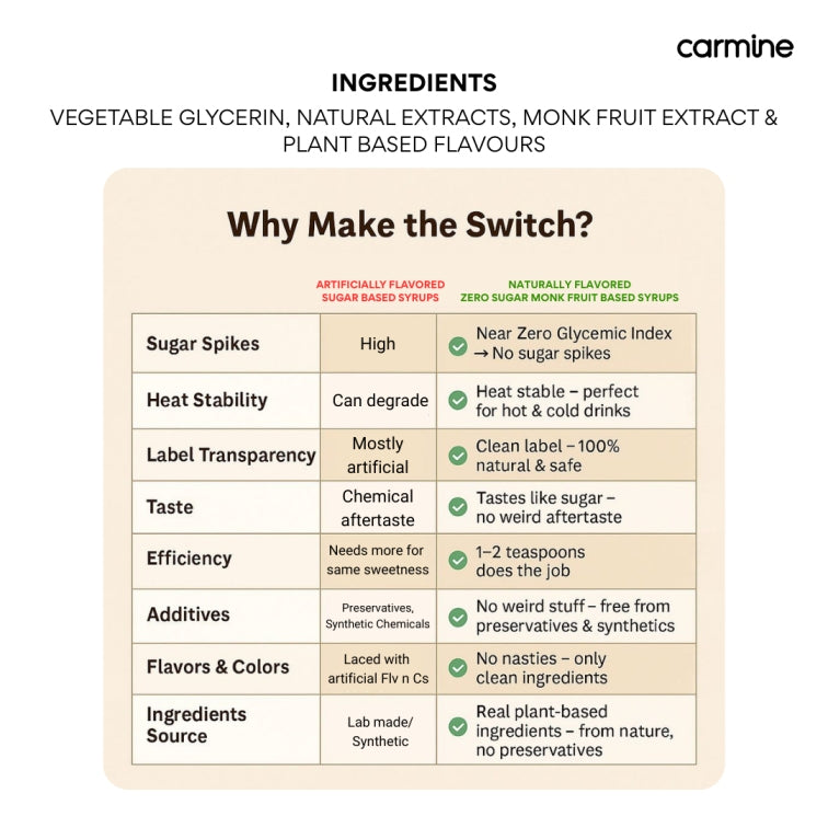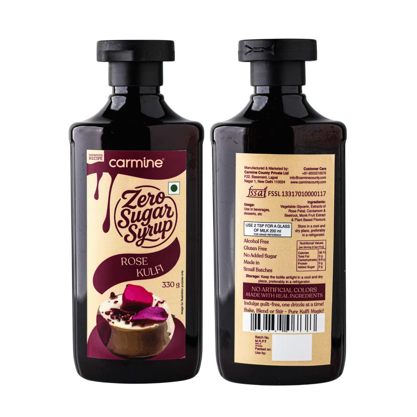 Carmine Zero Sugar Rose Kulfi Syrup is a tribute to authentic Indian flavours, thoughtfully crafted for the conscious modern palate. This unique syrup blends the floral delicacy of real rose with the nutty, creamy undertones of traditional kulfi, delivering a dessert-inspired experience that’s both luxurious and clean.